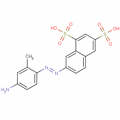 CAS NO : 2494-93-1 EC NO : 219-670-2 MF : C17H15N3O6S2 MW : 421.4475 Specification : 99% min Synonyms : 1,3-Naphthalenedisulfonic acid, 7-(2-(4-amino-2-methylphenyl)diazenyl)-;NSC 65536;1,3-Naphthalenedisulfonic acid, 7-((4-amino-2-methylphenyl)azo)-;1,3-Naphthalenedisulfonic acid, 7-((4-amino-o-tolyl)azo)- (8CI);7-((4-Amino-o-tolyl)azo)naphthalene-1,3-disulphonic acid;7-[(E)-(4-amino-2-methylphenyl)diazenyl]naphthalene-1,3-disulfonic acid;7-(4-amino-2-methyl-phenyl)azonaphthalene-1,3-disulfonic acid;1,3-Naphthalenedisulfonic Acid-7(4-Amino-2-Methphenyl)Azo; Molecular Structure :